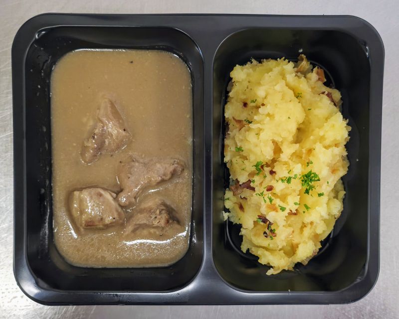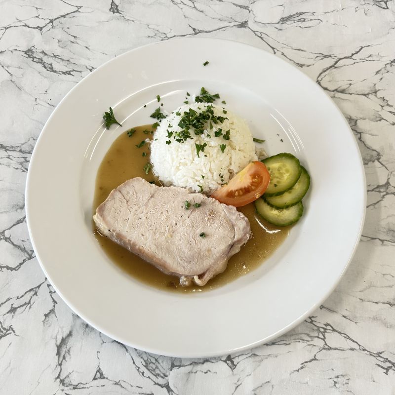 VEPŘOVÉ DUŠENÉ NA ŽAMPIONECH, dušená kulatozrnná rýže, sterilovaný okurek