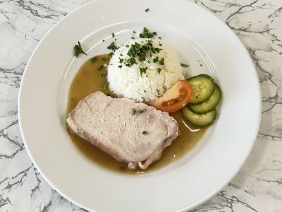 GRILOVANÉ KUŘECÍ STEHNO, dušená kulatozrnná rýže, broskvový kompot