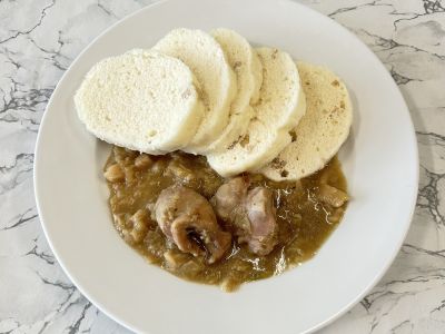 150 g Králičí stehno na smetaně s domácím karlovarským knedlíkem, dezert