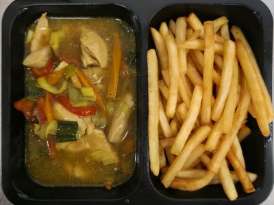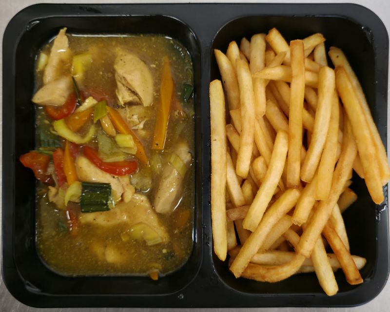 Vepřová panenka s ananasem z pánve WOK, hranolky / nebo rýže-nahlásit/
