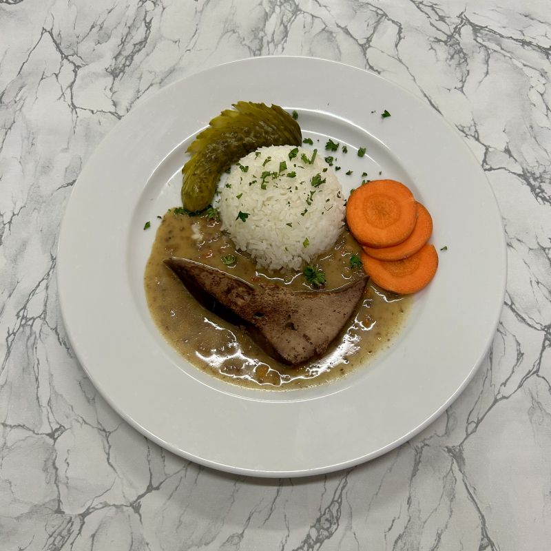 DOMÁCÍ ZABIJAČKOVÝ PAJŠL / vepřové srdce a jazyk na smetaně /, houskový knedlík