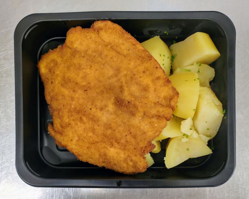 SMAŽENÝ VÍDEŇSKÝ TELECÍ ŘÍZEK, lahůdkový bramborový salát s majonézou