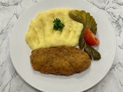 150 g Smažená kuřecí kapsa "Herkules", bramborová kaše, kompot