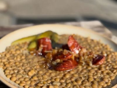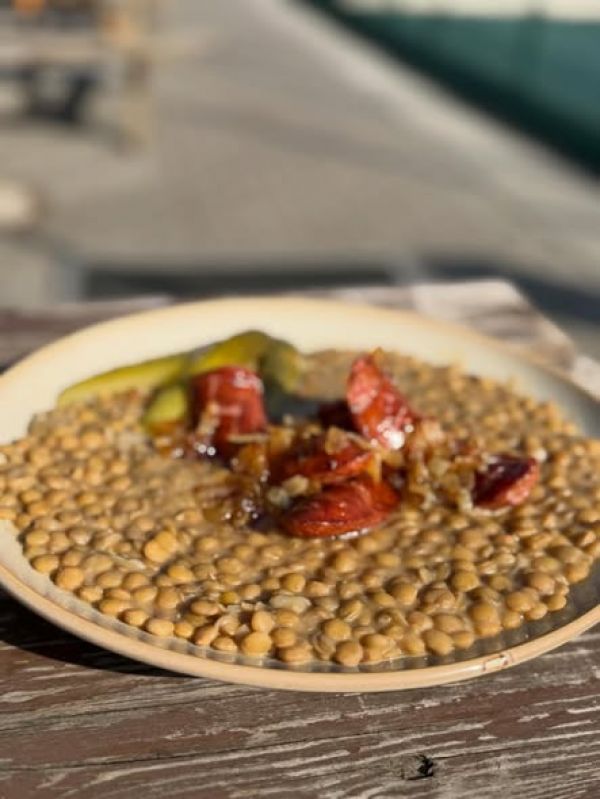 Čočka na kyselo, grilovaná klobáska, okurek, chléb 1, 3, 7