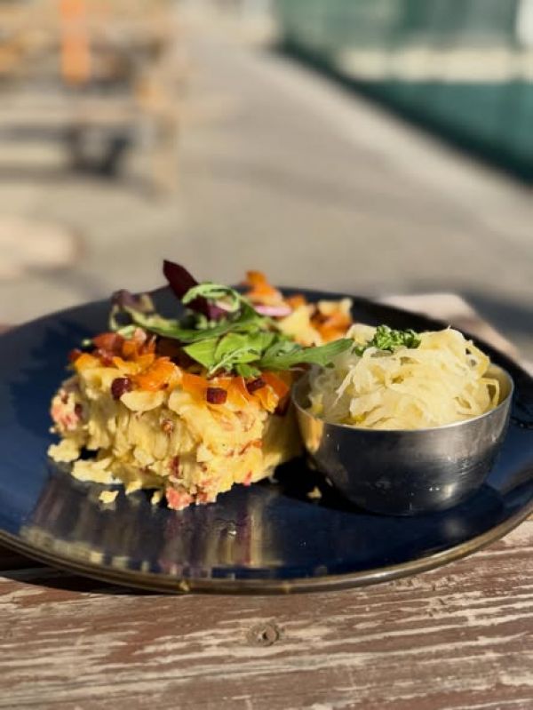 Pečený domácí jitrnicový prejt, salát z kysaného zelí, vařené brambory s petrželkou
