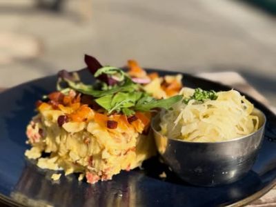 Pštrosí vejce, bramborová kaše, okurkový salát