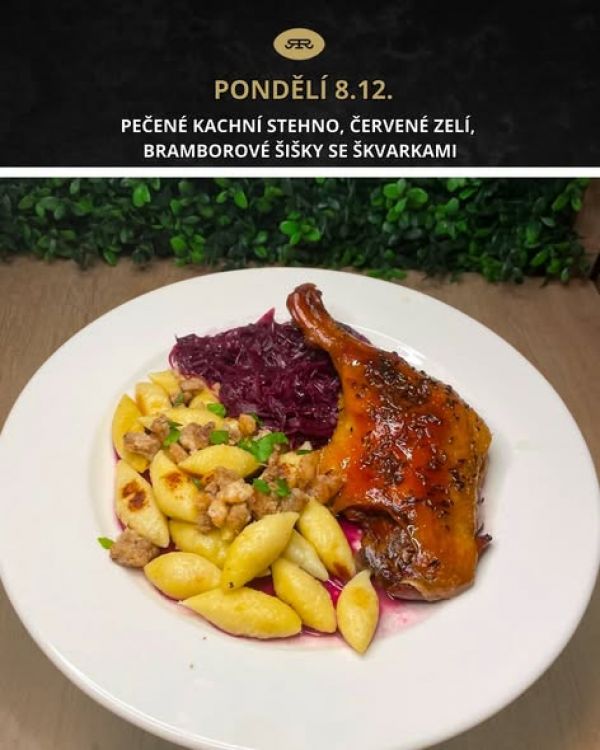 Konfitované kachní stehno, červené zelí, bramborové knedlíky (1, 3)