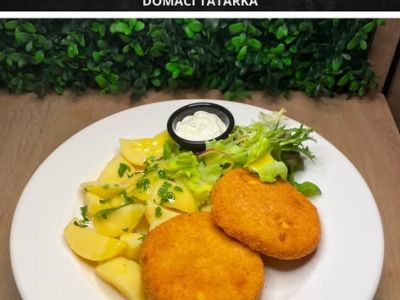 150g Smažená vepřová kapsa se slaninou a nivou, pečený brambor, tatarka