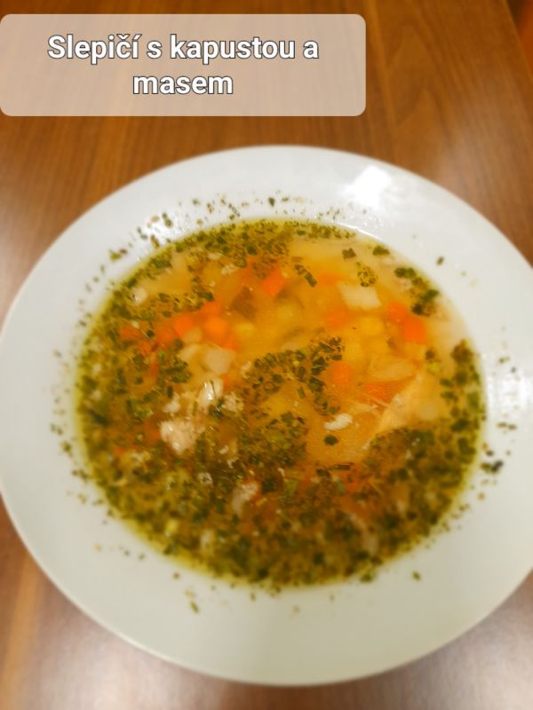 Zelná polévka s trhaným vepřovým masem a uzeninou