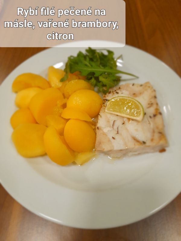 1ks pstruh na roštu s hráškovým pyré, vařené brambory