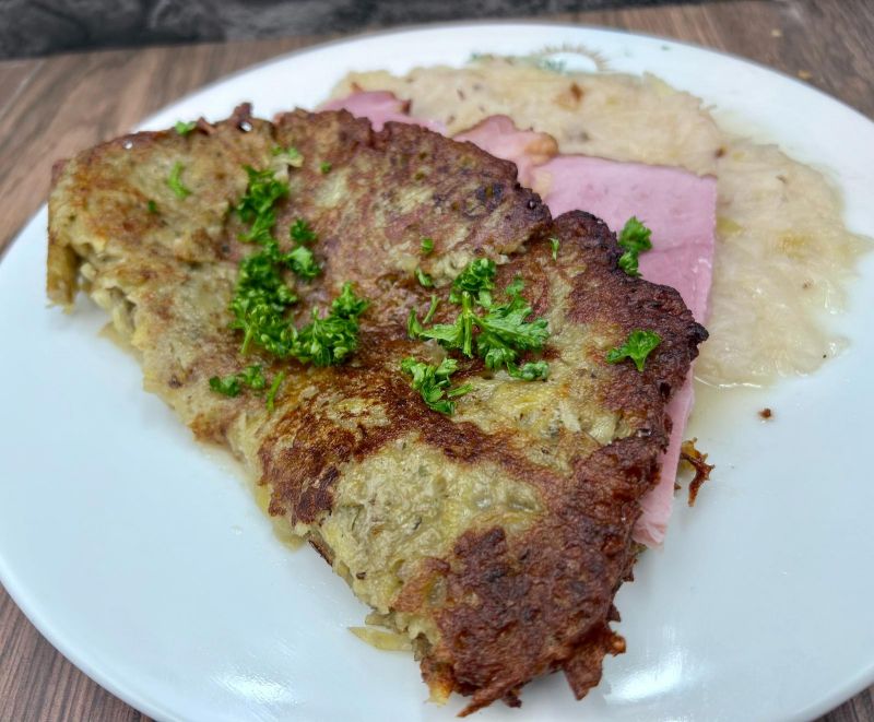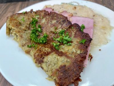 150g moravské uzené s bramborovou kaší, smažená cibulka, kyselá okurka 1, 7