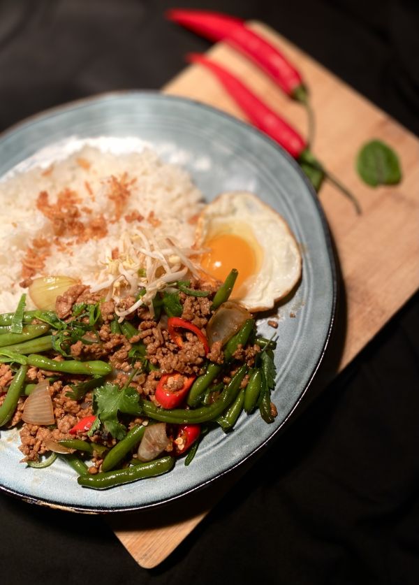 Zvěřinové ragú na víně. Pomalu dušené kousky kančí plece v silné redukci z kořenové zeleniny, divokého koření a červeného vína. Šťavnaté maso s bohatou tmavou omáčkou podáváme s nadýchanou rýží promíchanou s mladým hráškem pro svěží kontrast.