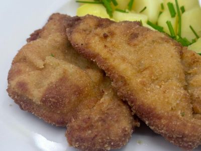 Smažený kuřecí řízek. Šťavnatý kuřecí řízek obalený v tradičním trojobalu a smažený dozlatova. Podávaný s vařenými bramborami maštěnými čerstvým máslem a sypanými petrželkou.
