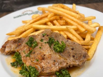 Vepřová kotleta s medovou omáčkou, vařené brambory nebo smažené hranolky 7
