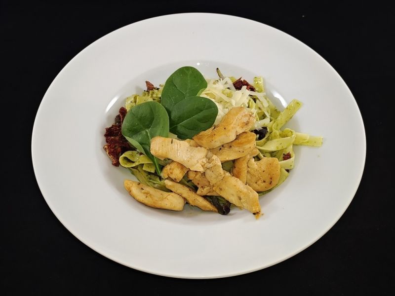 Penne Meditareanna (kuřecí, sušená rajčata, olivy, penne, olivový olej, tvrdý strouhaný sýr, bazalkové pesto)