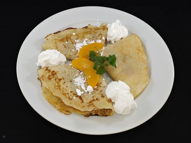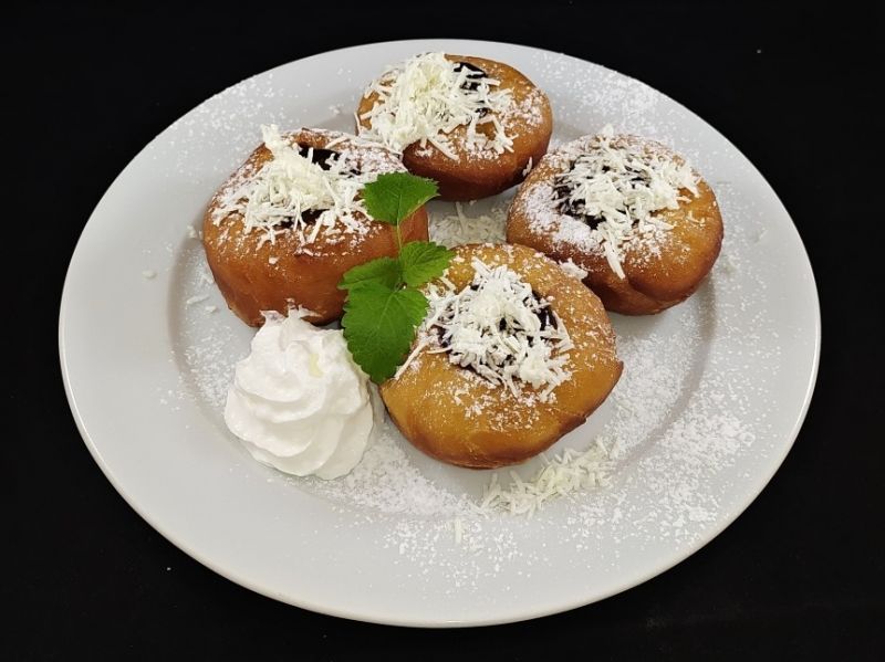 3. OVOCNÉ KNEDLÍKY — knedlíky, ovoce dle denní nabídky (obvykle borůvky, jahody, meruňky, švestky), zakysaná smetana, máslo, strouhanka, moučkový cukr