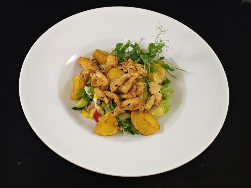 MENU:Smažený kuřecí řízek. Šťavnatý kuřecí řízek obalený v tradičním trojobalu a smažený dozlatova. Podávaný s vařenými bramborami maštěnými čerstvým máslem a sypanými petrželkou.