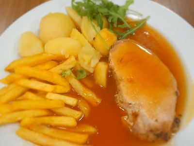 150g pečená krkovice s dušenou kapustou, vařené brambory 1, 7