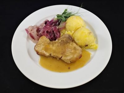 150g Vepřová kotleta na grilu, sázené vejce, šťouchané brambory
