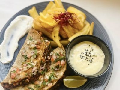 120g Tortilla s kuřecím masem, polníček, salát Coleslaw, rajče, tenké hranolky