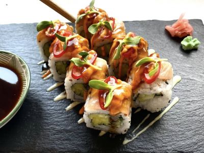 PokeBowl. Jemné plátky uzeného lososa a marinované tofu hrají hlavní roli v této svěží misce. Základ tvoří sushi rýže s wakame řasami a edamame boby. Miska je doplněna krémovým avokádem, sladkým mangem, ředkvičkou a čerstvým listovým salátkem.
