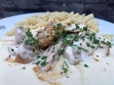 280g Těstovinový salát se 120g kuřecích prs, dip, zelenina, opečený toast