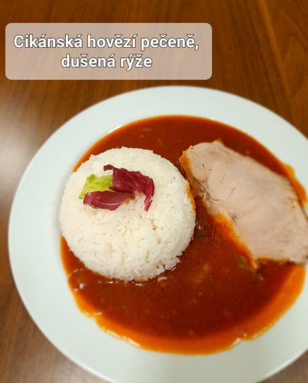 150g cikánská hovězí pečeně, houskový knedlík nebo rýže