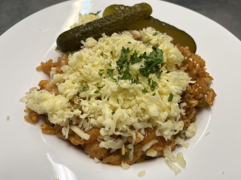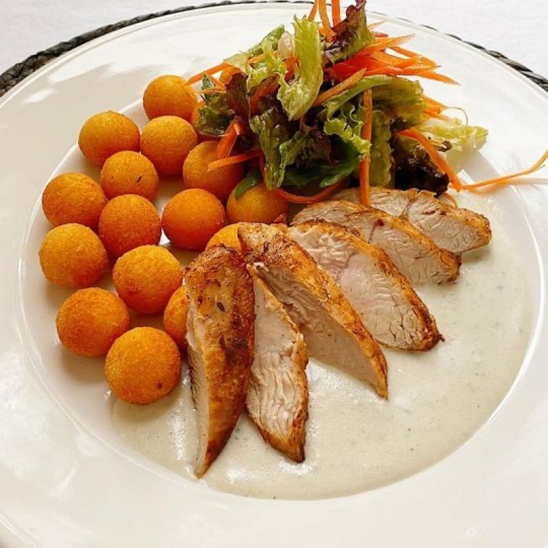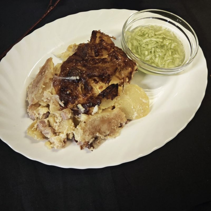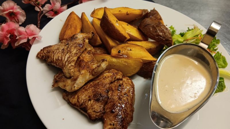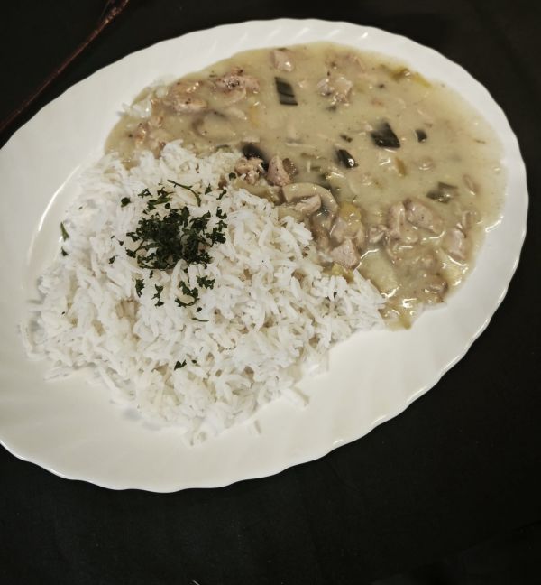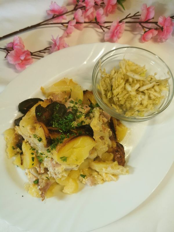 Pikantule (kuřecí prsa na nudličky, americký brambor, niva, smetana, brokolice a zapečené sýrem)