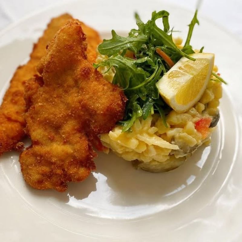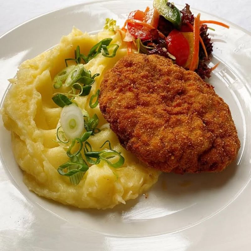 200g Vídeňský řízek z vepřové panenky pomalu smažený na sádle, bramborový salát/vařený brambor
