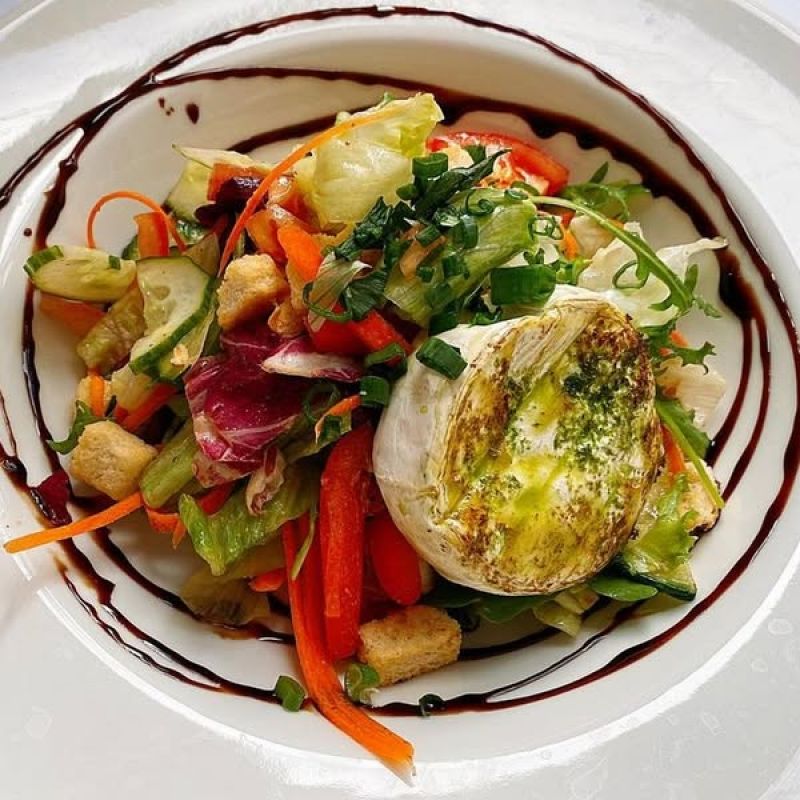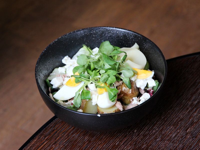 Zeleninový salát se sázeným vejcem a nivou, křupavá bagetka
