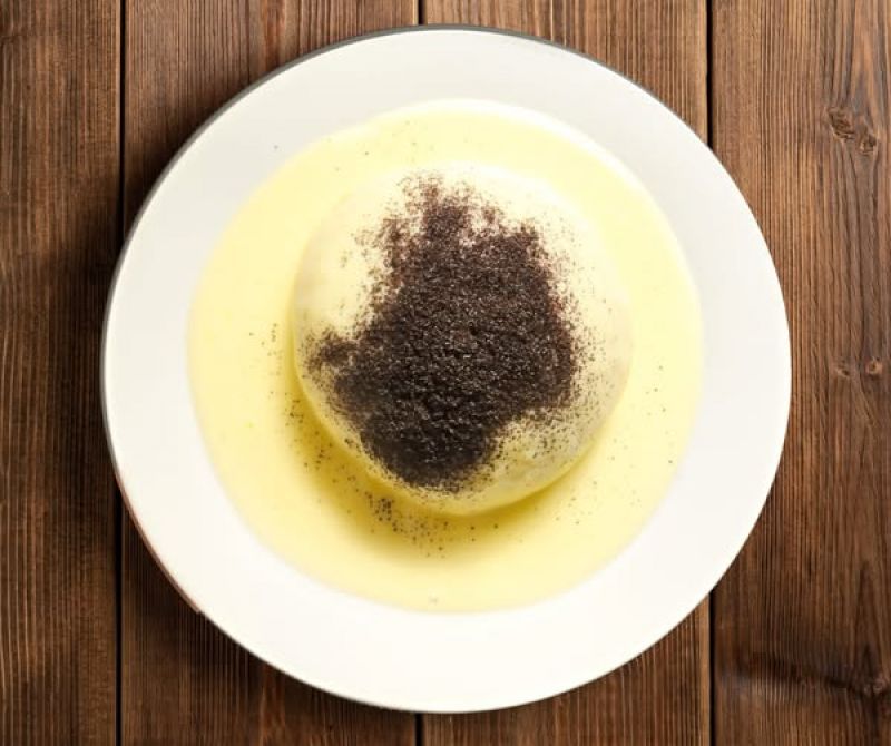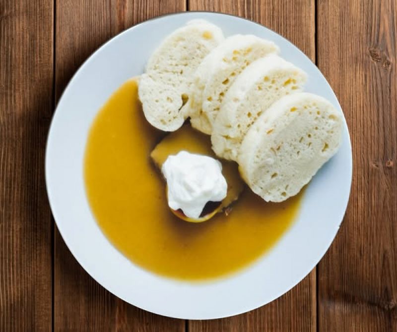 2 ks Bramborový knedlík s trhaným vepřovým, houbová omáčka, cib. máslo