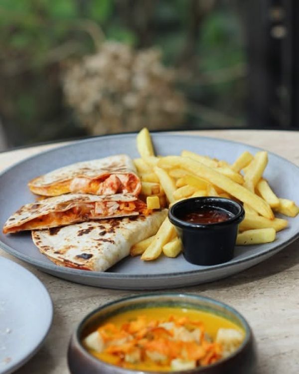 (180 g) Qurrito s kuřecím v těstíčku, cheddarem, BBQ omáčkou, malé hranolky a dip ze zakysané smetany