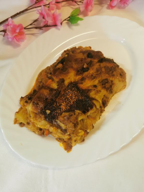 Zapečené těstoviny s uzeným masem, sýrem a špenátem