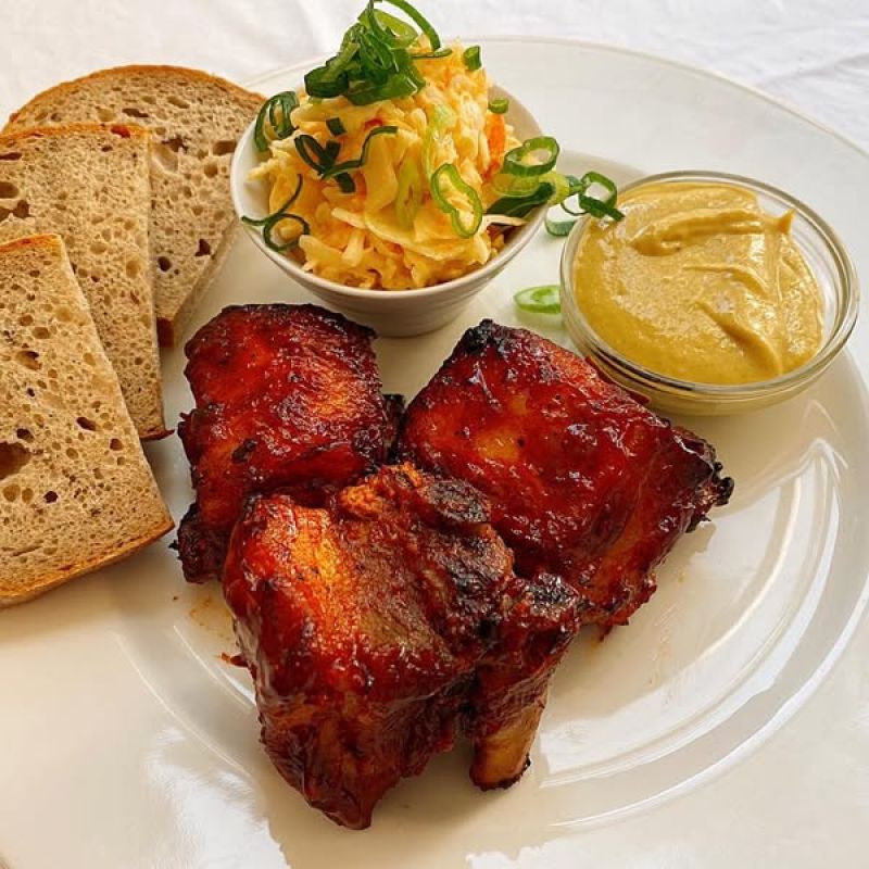 Žebírka v BBQ marinádě, salátek, křen, chléb