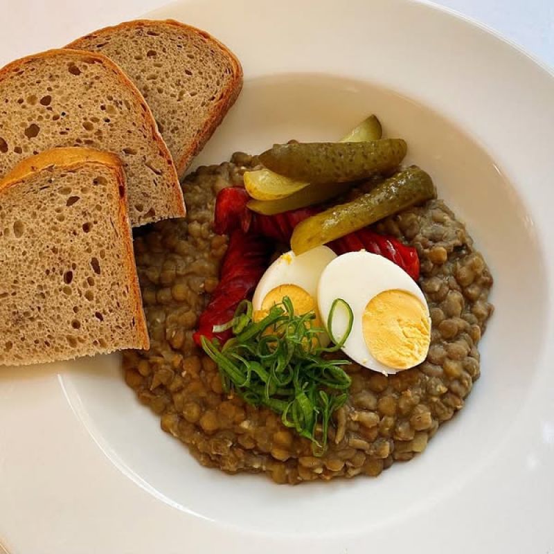 Vařené vejce a klobása, čočka na kyselo, cibulka, chléb, kyselý okurek