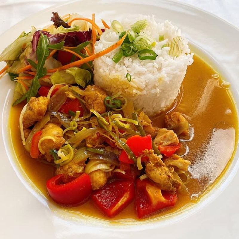 Sladko-kyselé kuře s kousky papriky a jarní cibulkou, jasmínová rýže