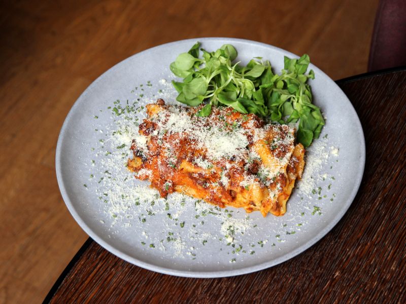 Zapečené flíčky s uzeným masem a houbami, červená řepa