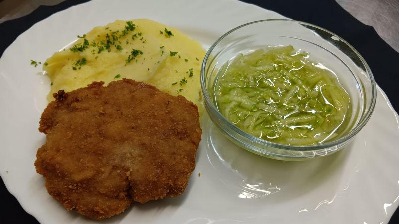 Smažený kuřecí řízek, bramborová kaše, kyselý okurek