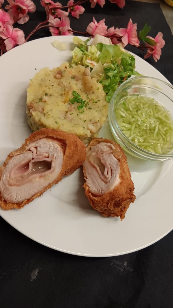 Kuřecí roláda plněná šunkou, vejcem a hráškem, bramborová kaše, okurkový salát