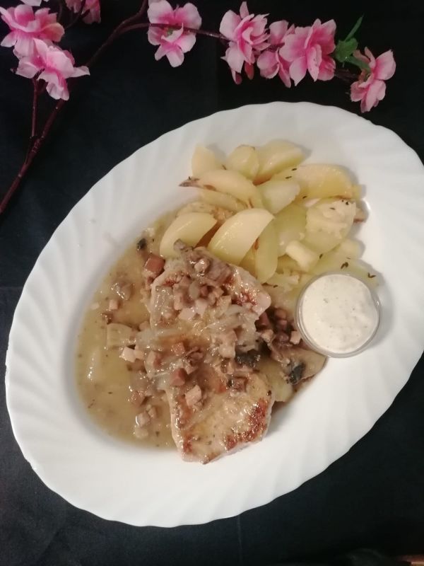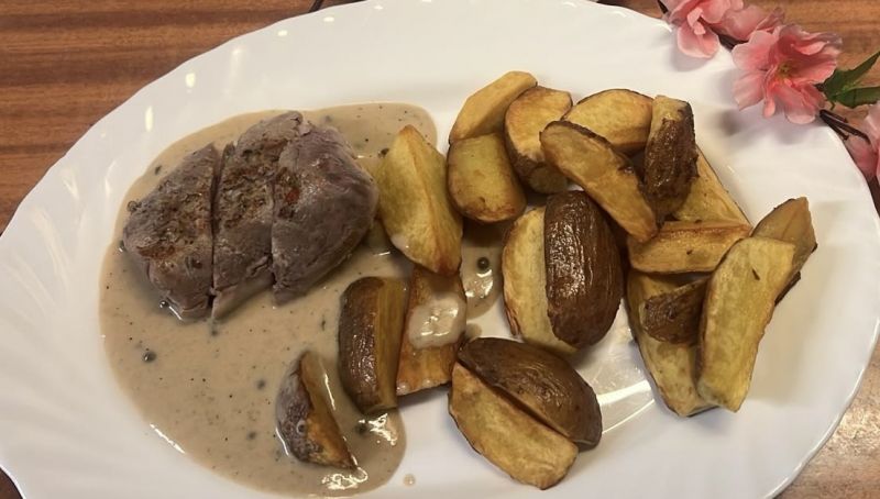 Steak z vepřové krkovičky zapečený hermelínem s brusinkovou omáčkou, pečené grenaille s tymiánem 1, 7