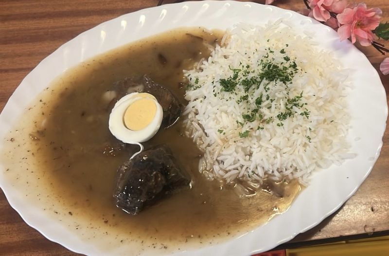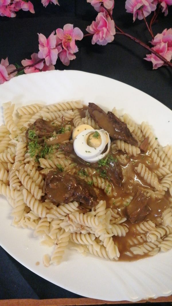 1. Hovězí maso po námořnicku s vejci a sýrem, těstoviny