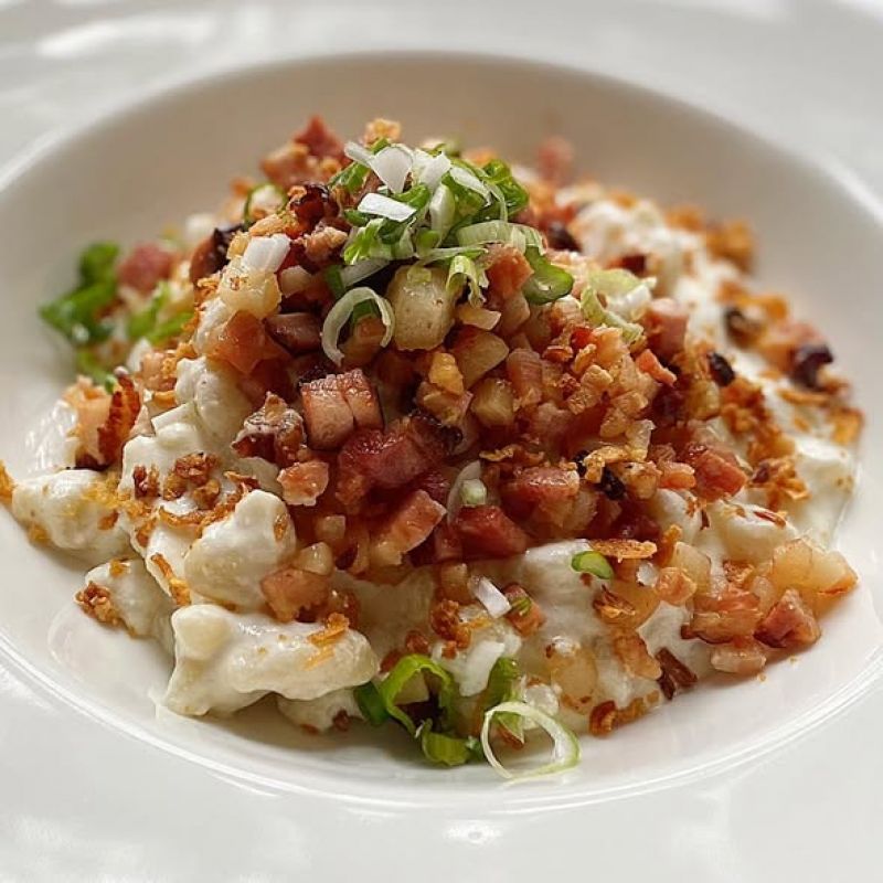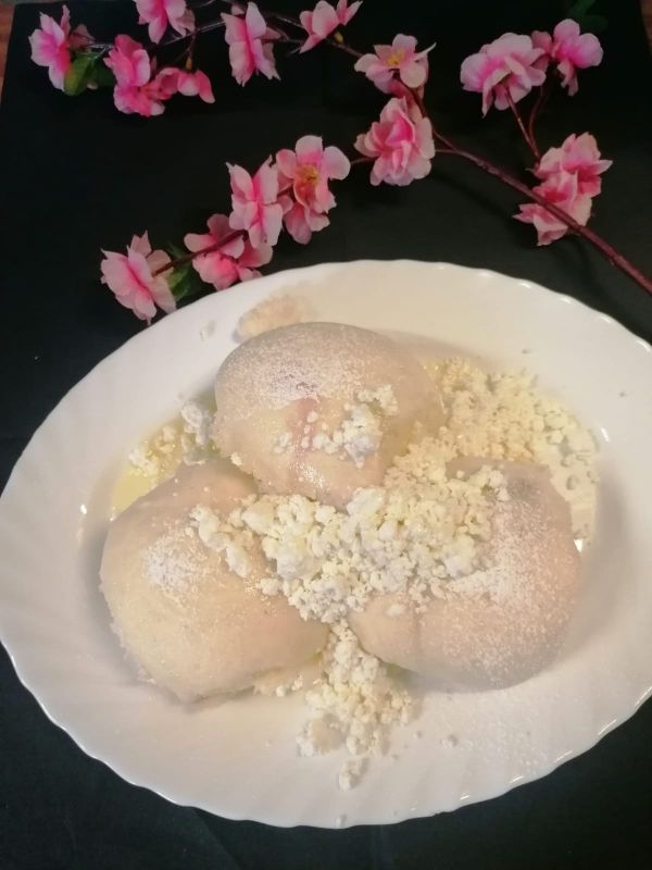 Bramborové knedlíky plněné uzeným masem a zelím, sypané smaženou cibulkou