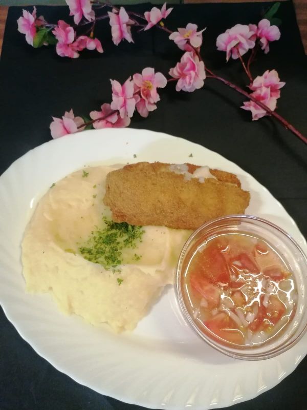 130g Řízky z tmavé tresky v panko strouhance, bramborové pyré s karotkou