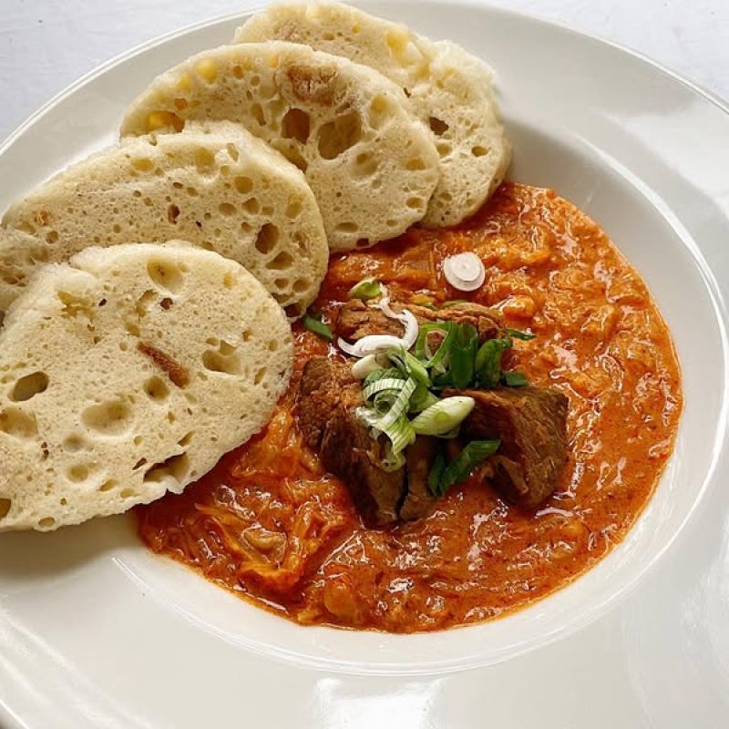 Chalupářský vepřový guláš, cibule, houskový knedlík