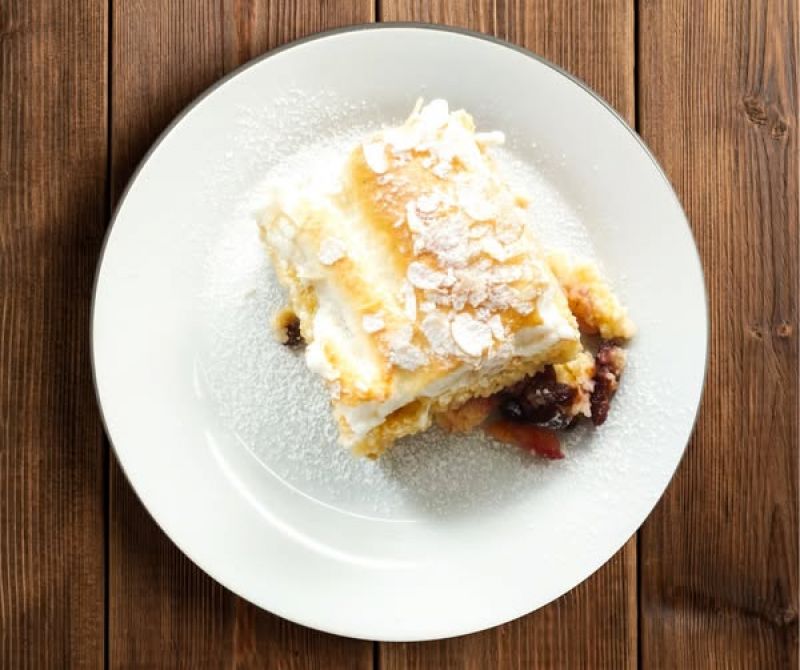 Kynutý knedlík s povidly sypaný tvarohem, cukr, máslo