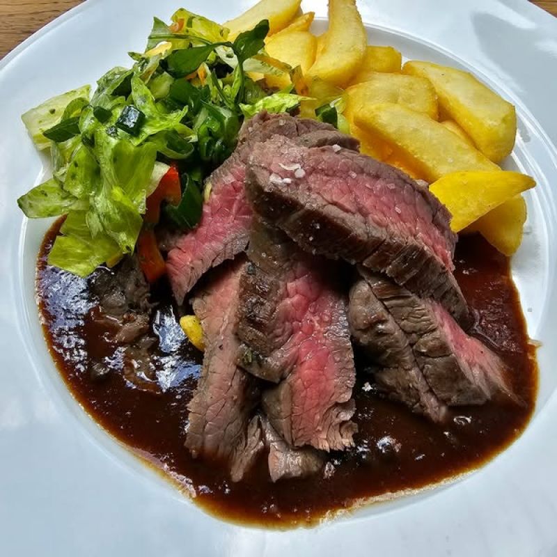 200g Flank steak z vyzrálého hovězího, hříbková nebo pepřová omáčka, americké brambory nebo steakové hranolky