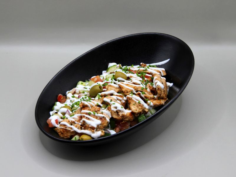 3. Kuřecí Kebab s čerstvou zeleninou a rýží basmati, dresing na maso (česnekový / bylinkový) + omáčka na rýžii (sweetchilli / curry)