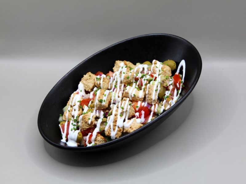 120g Bramborák plněný směsí z vepřové panenky a zeleniny, trhaný salát s cherry rajčaty a okurkami, česnekový dip