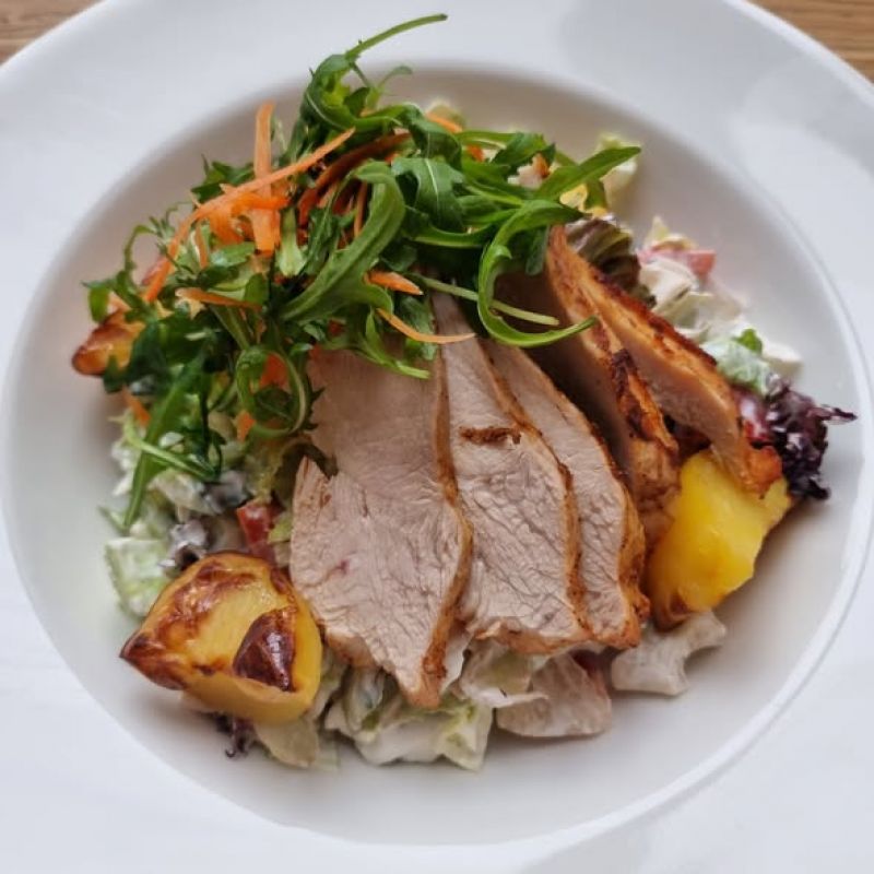 Bowl s kuřecím masem, kuskusem, sýrem chedar, zeleninou a jogurtovým dresinkem