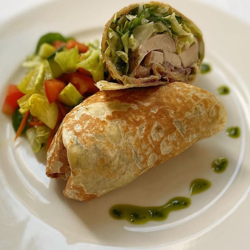 100g Kuřecí tortila, hranolky, ledový salát, kysaná smetana